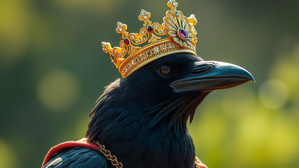 Majestic crow, draped in opulence, wearing a striking crown and perched with dignity. Its head is illuminated, the adornments glimmering brilliantly under the sunlight, exuding an aura of noble elegance.