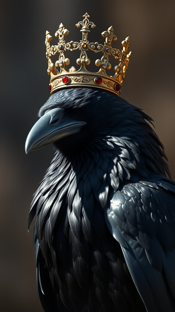 Majestic crow with a striking crown perched atop its head, adorned in regal attire, glimmering in the sunlight, surrounded by an aura of subtle elegance and depth.