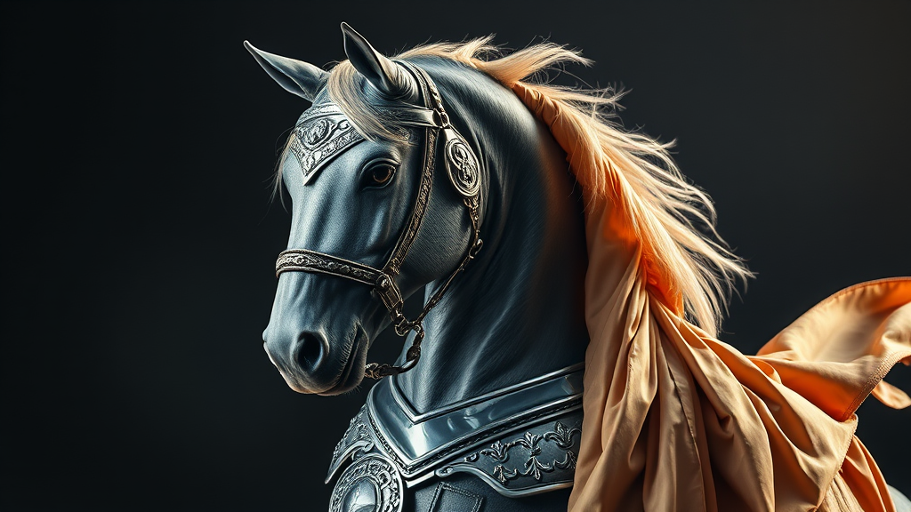 Majestic dangerhorse in an elaborate portrait, showcasing finely detailed armor with intricate silver designs, draped in luxurious silk, set against cinematic lighting in ultra-high definition, subtly enhanced with balanced negative space for an artistic presentation.