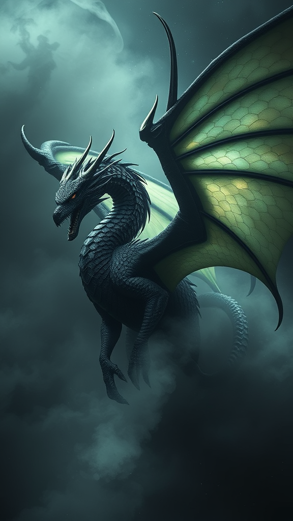Majestic dark dragon with opalescent scale wings, enveloped in spiraling ethereal mist against a shadowy fog-laden backdrop, reminiscent of Magic the Gathering, inspired by the styles of Andrei Riabovitchev, Massimo Caggese, Peter Mohrbacher, with an ominous and intricate design. Rendered in octane, Moebius, and influenced by Arney Freytag, the dragon strikes a stunning pose, perfectly composed for ArtStation with dramatic interplay of light and shadow. Featuring orthodox symbolism within its tribal and cinematic dark fantasy theme, it exudes magic realism in an 8k resolution. The visual is richly complex, hyper-maximalist, and steeped in detail, steeped in ambient tones for a truly immersive experience.
