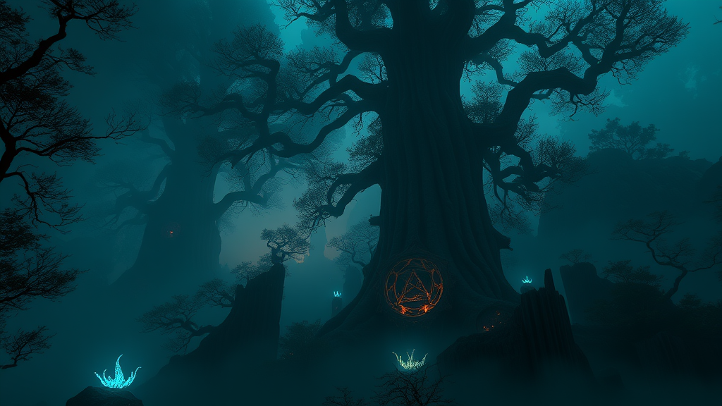 Majestic dark fantasy landscape with realistic lighting, featuring towering ancient trees and mystical fog, captured in Full HD and 8K resolution. Intricate details reveal hidden creatures and ethereal glows, reminiscent of concept art from the Unreal Engine. The scene is trending on Artstation with stunning volumetric lighting casting dynamic shadows and vibrant highlights, creating an otherworldly atmosphere that captivates with a sense of mystery and enchantment.