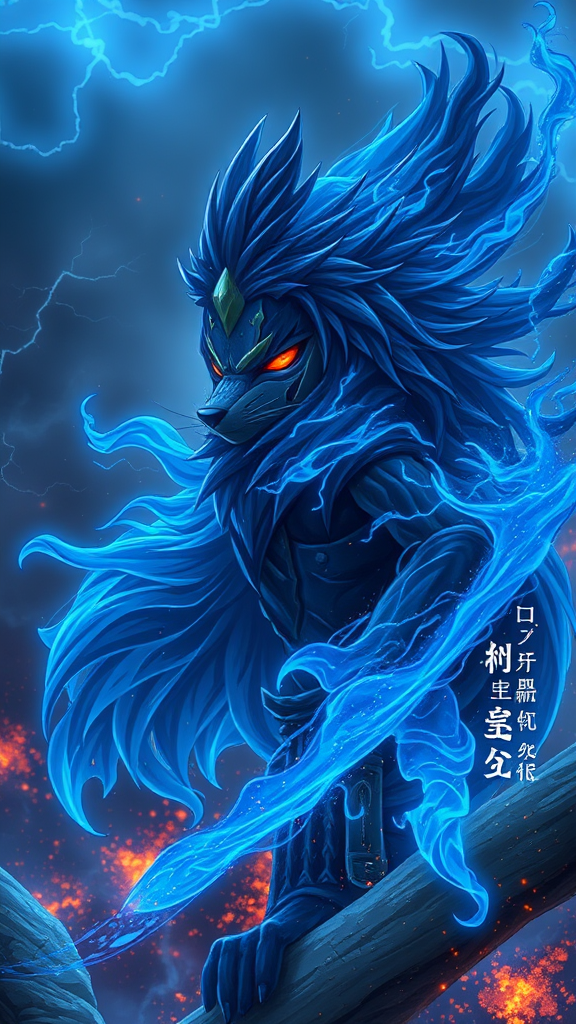 Majestic dark fox emanating deep azure flames of mystical energy anime style, 8K resolution, enchanting humanoid sorcerer prince of shadows dominating the battlefield, swirling blue infernal flames and radiant sparks creating a vivid backdrop, apocalyptic scene, vibrant colors, intricate and elegant digital illustration, breathtaking and hyper-detailed scenery, 8k clarity, amidst a raging thunderstorm.