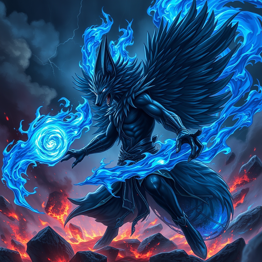 Majestic dark fox wielding intense dark blue flames of energy, anime style, 8K resolution, sorcerer humanoid male prince of shadows dominating the battlefield, surrounded by swirling blue infernal flames and sparks in the background, apocalyptic setting, vibrant colors, intricate and elegant digital illustration, scenic and hyper-detailed, 8K, raging thunderstorm enveloping the scene.