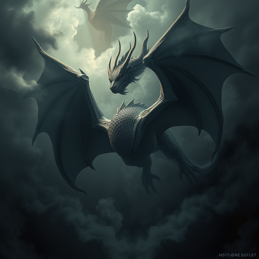 Majestic darkness encompasses a colossal royal dragon, its scaled wings glistening with intricate detail, embodying the essence of Magic the Gathering. The creature is enveloped in swirling smoke, hovering in a dense, dark fog. This evocative scene is reminiscent of masterpieces by Andrei Riabovitchev, Massimo Caggese, and Peter Mohrbacher. The dragon strikes a stunning pose amidst ominous intricacy, reminiscent of Moebius and Arney Freytag's works. The artwork showcases a perfect composition with dramatic lighting and shadows, drawing upon orthodox symbolism. It is a blend of concept art, ambient magic realism, and tribal dark fantasy, rendered in hyper-maximalist detail at an 8k resolution. The complexity is enhanced by cinematic storytelling elements, creating a captivating, otherworldly narrative.