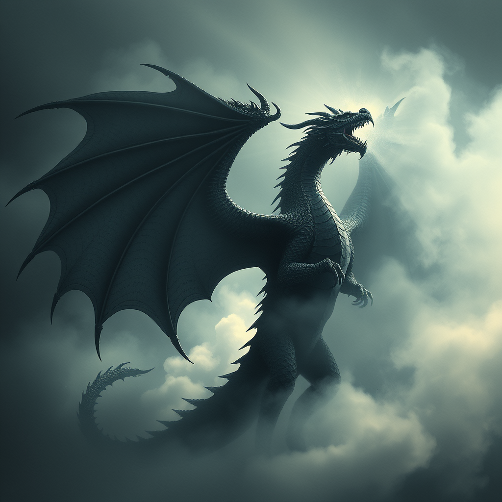 Majestic darkness envelops a colossal royal dragon with intricate scale wings, inspired by the realms of Magic: The Gathering, spiraling in ethereal smoke amidst a mysterious fog-filled backdrop. Drawing on the artistic influence of Andrei Riabovitchev, Massimo Caggese, and Peter Mohrbacher, the scene exudes a sense of ominous intricacy and vivid depth, harmonizing with the styles of Moebius and Arney Freytag. The dragon strikes a breathtaking pose, embodying both strength and grandeur, as showcased on ArtStation, within a flawless composition featuring dramatic lighting and shadows that play with orthodox symbolism. This piece of concept art blends ambient magic realism with a hyper-maximalist, overly detailed cinematic tribal dark fantasy, presented in stunning 8k resolution.