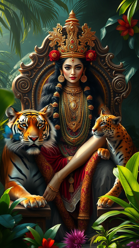 Majestic π deity adorned with intricate ornaments sits elegantly on a jungle throne, flanked by a regal tiger and sleek panther, surrounded by luxuriant foliage and vibrant flora in a vivid, cinematic light. The scene embodies the essence of junglecore aesthetics, capturing an otherworldly allure. This character portrait showcases exquisite detail in facial features and textures, reminiscent of Annie Leibovitz’s photography style, while enhanced by Pratik Naik’s meticulous retouching, evoking a sense of mystical elegance and untamed beauty.