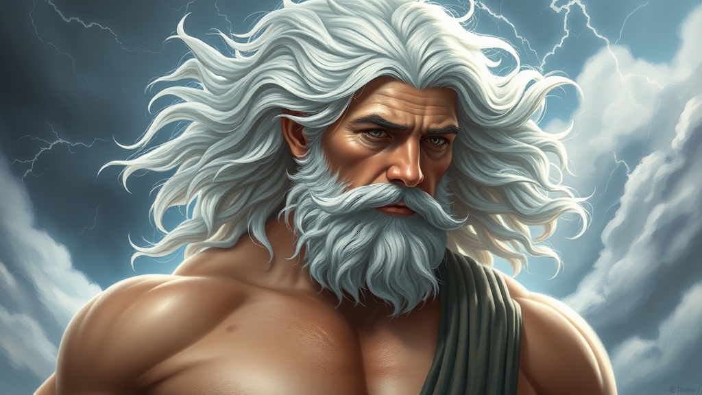 Majestic depiction of Zeus, the thunderous Greek god, with impressive white hair flowing around his distinguished, masculine face. His appearance is mature yet handsomely rugged, showcasing a muscular upper body with a naturally hairy torso. This fantasy-inspired portrait is intricately detailed, capturing an elegant fusion of digital painting styles reminiscent of Gaston Bussiere and Alphonse Mucha. The artwork is smooth, with a sharp focus, exuding the grandeur and power of Zeus. Set against a celestial backdrop, this concept art portrays the god in a moment of serene introspection, subtly integrating elements of stormy weather to reflect his dominion over thunder and lightning.