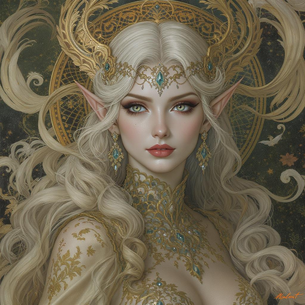 Majestic digital painting of a female elf, captured in mdjrny-v4 style, featuring an intricate and elegant design with exceptional detail. This smooth and sharply focused portrait showcases the artistry of artgerm and greg rutkowski, infused with the decorative flair of alphonse mucha. Her features are graceful and ethereal, framed by a cascade of flowing, ornate hair. The background is a blend of nature-inspired motifs, merging seamlessly with the character's attire, offering a harmonious balance and captivating depth. The artwork exudes a sense of timeless beauty and is rendered in stunning 8k quality, making it a mesmerizing and enchanting visual masterpiece.