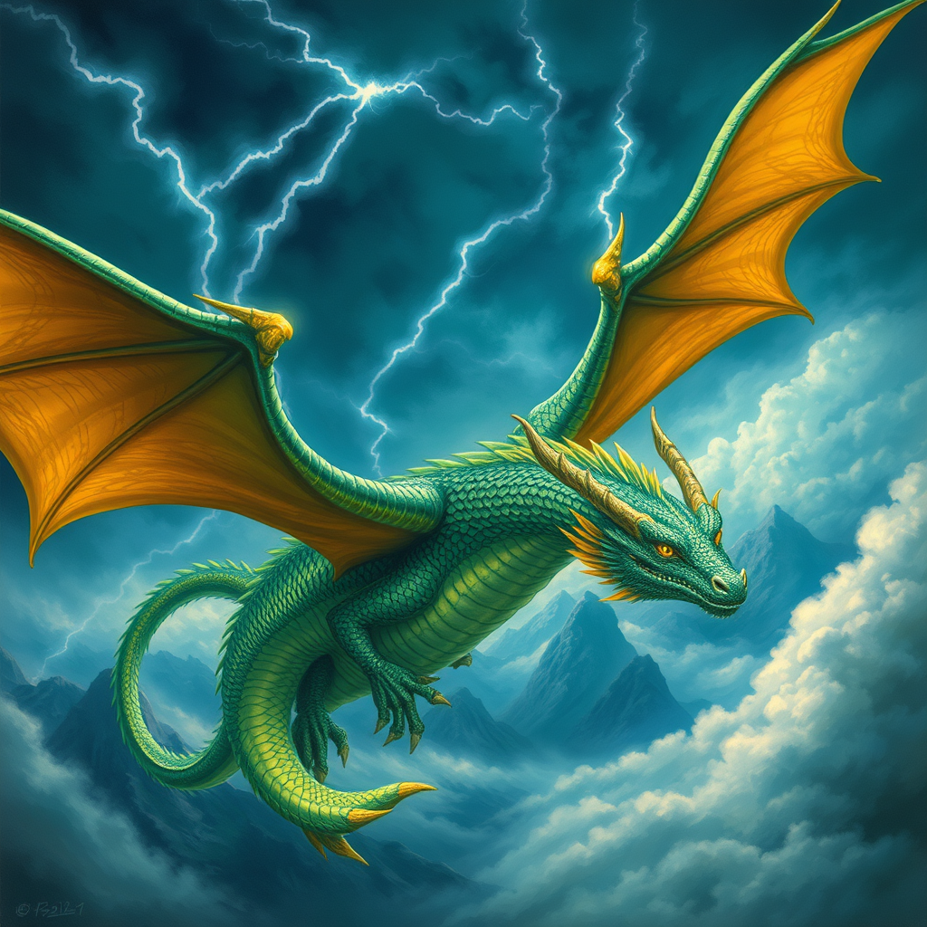 Majestic dragon soaring through a stormy sky, painted in vivid hues of emerald and gold. Its scales shimmer with an ethereal glow as lightning illuminates its powerful wings. In the distance, towering mountains and swirling clouds create a dramatic backdrop, evoking an epic sense of wonder and mystery. The dragon's wise eyes reflect centuries of legends and untold tales.