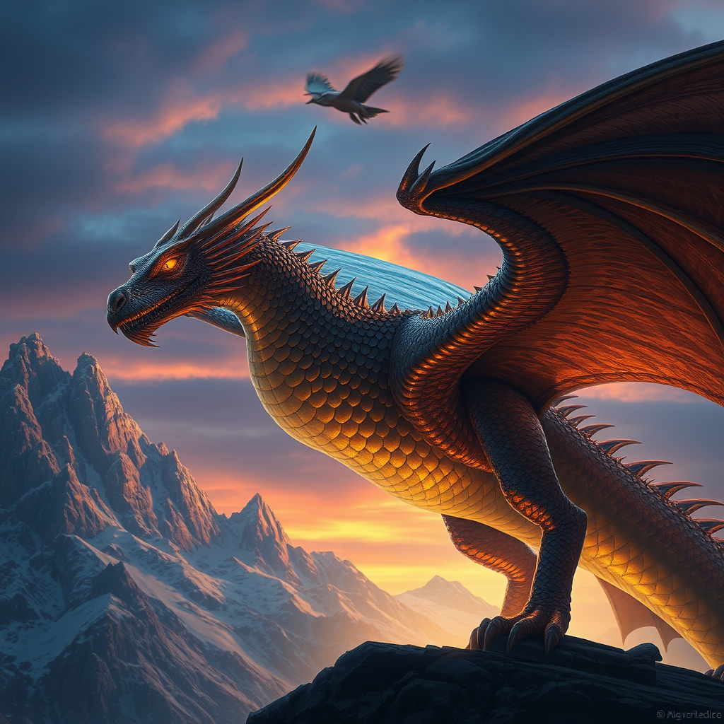 Majestic drake by Antonio J. Manzanedo, ultra-detailed scales shimmering in twilight hues, set against a towering mountain backdrop. The dragon's eyes, glistening like molten gold, survey the scene with ancient wisdom. Its wings, expansive and translucent, flutter softly in the crisp evening air. The lengthened form captures the essence of both grace and power in a vertical panorama, breathing life into legendary tales. Enigmatic aura resonates with timeless mystique.