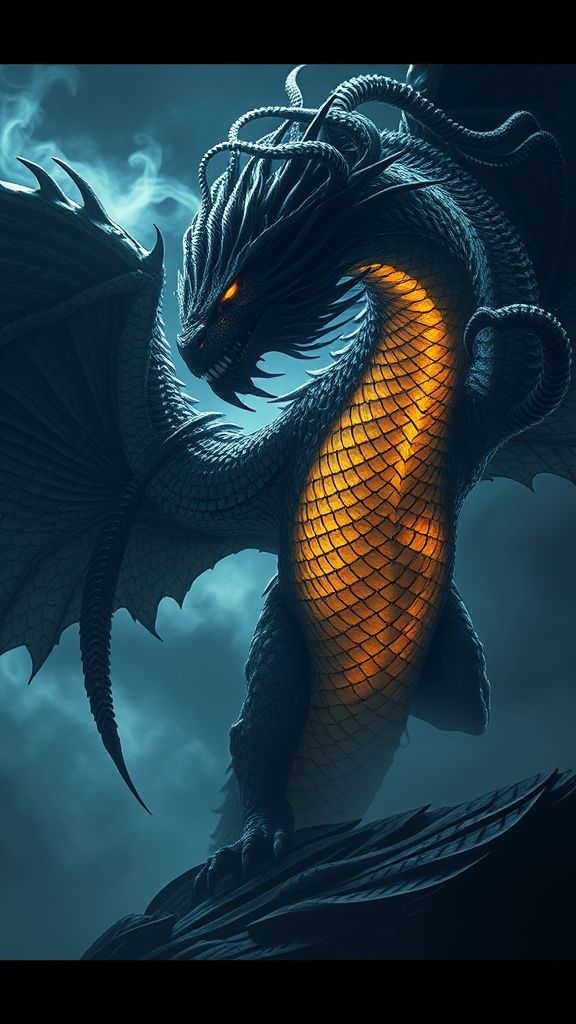 Majestic enormous dragon with flowing obsidian mane and intricate scale wings, evoking Magic the Gathering vibes, alabaster skin glowing in high contrast with swirling mist lit from behind, art by Andrei Riabovitchev, JohnnyD, Massimo Caggese, Peter Mohrbacher, with a signature ominous and intricate style, utilizing octane rendering and inspired by Moebius, Arney Freytag, set in a fashion photo shoot theme, striking a breathtaking pose, featured on ArtStation, enveloped in dramatic lighting and shadows, infused with orthodox symbolism, embodying concept art and ambient magic realism, captured in 8k resolution, showcasing a hyper-maximalist detailed cinematic tribal dark fantasy scene.