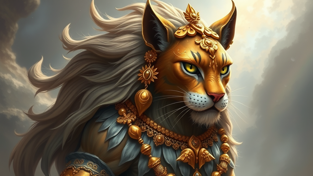 Majestic feline deity adorned with golden jewelry, guardian of home and hearth, embodying grace and protection while wielding the power of a lioness with the wisdom of an ancient sage.