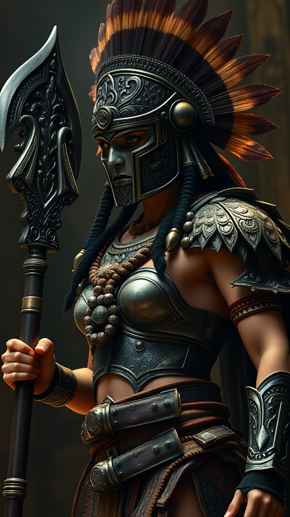 Majestic female Aztec warrior exuding strength and grace, adorned with a meticulously crafted full battle face mask and helmet. Her finely detailed armor glistens under dramatic lighting, highlighting its ornate patterns and textures. She wields a fearsome obsidian-edged club, an emblem of power, its intricate design echoing ancient artistry. Her presence is both commanding and enigmatic, captured in a waist-length composition that emphasizes her poised stance. The cinematic ambiance is enhanced by emotional, epic lighting that casts deep shadows and striking highlights, creating a scene of intense realism. This visual masterpiece, rendered with extraordinary detail quality, immerses viewers in a realm that transcends reality with its photorealistic, movie-quality depiction.
