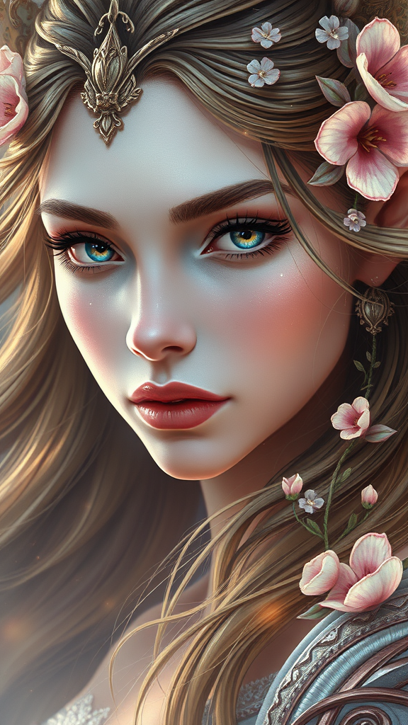 majestic female elf portrait, intricate and elegant design, highly detailed digital painting, inspired by artstation concept art, smooth and sharp focus illustration, blending the styles of artgerm, greg rutkowski, and alphonse mucha, luminous 8k resolution, vibrant ethereal colors, delicate floral motifs intertwined in her flowing hair, regal yet mysterious expression, captivating deep eyes reflecting ancient wisdom, surrounded by an aura of otherworldly light