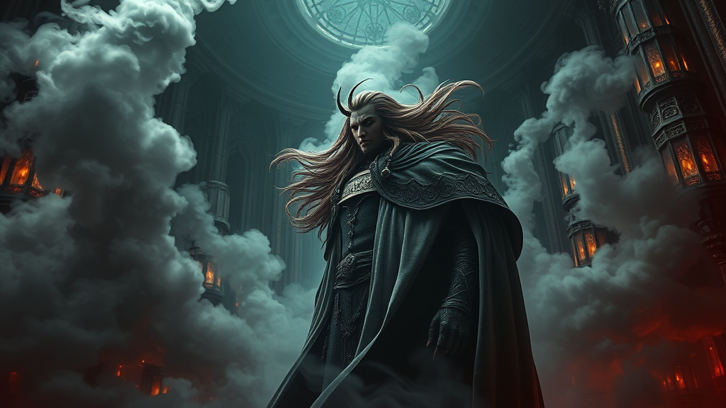 Majestic figure in a grand dark castle, enveloped in swirling smoke and clouds of toxic fumes, hair and cloak flowing dramatically. Evoke the essence of Magic the Gathering with vibrant contrasts and a sense of royal mystery. The scene is illuminated by dramatic shadows, infused with orthodox symbolism, and an ambient tribal dark fantasy atmosphere. Presented in ultra-detailed quality, the portrait captures an emotional and intricate display, rendered in 3D with Octane and Unreal Engine techniques. Isometrically framed for a cinematic impact, the composition achieves ultra-realism in 8k resolution, further enhanced with VFX and cinematic lighting, produced using Blender for a captivating visual experience.