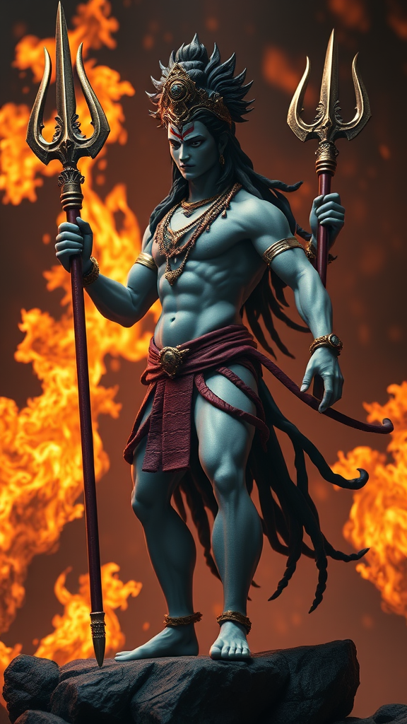 Majestic figure inspired by Lord Shiva from Indian mythology fused with a unique One Piece character, showcasing a perfectly balanced symmetric body. The figure brandishes an intricately designed three-pronged spear, exuding an aura of power and grace. The composition is extremely detailed, capturing every nuance with cinematic lighting that creates a striking high contrast. Set against a dramatic backdrop of roaring flames, the scene emanates intensity and dynamism, suitable for ArtStation character concept art. The visual is rendered in stunning 8K, capturing the essence of mythology and fantasy with a modern twist.
