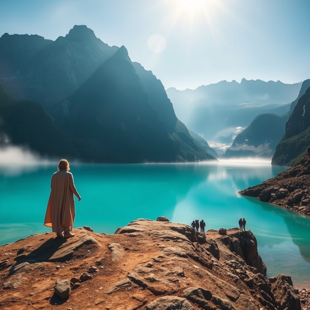 Majestic figure standing at the edge of a crystalline lake, radiating a warm bronze aura as they gaze out at a sprawling crescent-shaped mountain range, vibrant teal mist swirling around their feet, subtle energy pathways etched into the rocky terrain, hikers' footprints leading to a hidden waterfall in the distance.