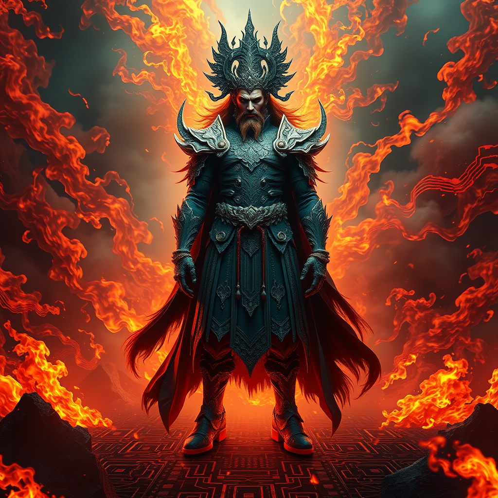 Majestic figure, the fierce lord of flames, stands amidst swirling infernos, surrounded by mist and fog, exuding an aura of power. His features, both beautiful and severe, are captured in perfect detail. Dressed in elaborate, ornate garments, he stands firmly on ground resembling circuit board patterns. This fantasy illustration showcases a deeply complex, hyper-maximalist, and cinematic theme, with tribal and dark fantasy elements. Created as ultra-detailed, high-definition 3D art, it employs an 8k octane render with photorealistic concept art qualities. The composition is sharp and flawless, with dramatic shadows and vibrant lighting, designed as a high-resolution, immersive wallpaper in HDR quality.