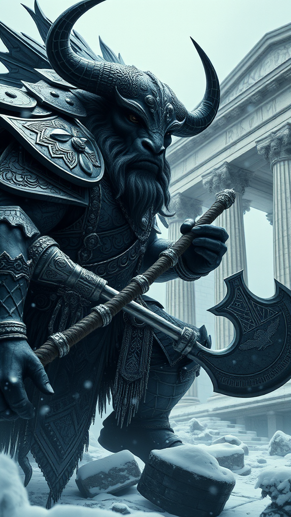 Majestic, Gigascale Minotaur Divinity with colossal War Axe, Engaged in Epic Confrontation, Adorned in Lavish, Intricately Engraved Black and platinum armor, Radiating an Omnipresent Dark Energy aura, Captured with Canon EOS 5DS digital camera, Masterpiece, Hyper-Detailed, Ultra-High Definition 12K digital illustration, Set amidst a mystical, snow-shrouded, Ancient Greek Temple backdrop with lush Greenery.