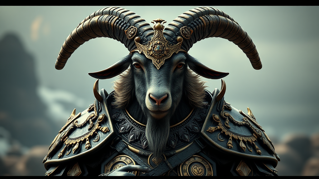 Majestic goat champion clad in resplendent Viking armor, exuding opulence and intricacy, a hypermaximalist marvel of craftsmanship, ornate and elite, evoking a haunting, ethereal presence. This cinematic masterpiece, reminiscent of the visionary styles of James Jean, Brian Froud, and Ross Tran, unveils a lavish scene in the realm of matte painting and cgsociety, where every detail is meticulously rendered to captivate and enchant.
