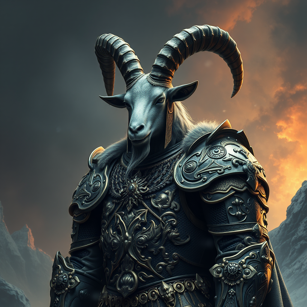 Majestic goat knight clad in opulent Norse armor, exuding elegance and intricacy, showcasing hyper-detailed artistry with elaborate and exquisite craftsmanship; a scene that is both elite and foreboding, capturing an ethereal and haunting presence. The composition reflects a rich matte painting style, blending cinematic elements with influences from cgsociety. Artists like James Jean, Brian Froud, and Ross Tran inspire the fantastical and surreal elements, painting a vivid picture of myth and legend intertwined with modern digital artistry.