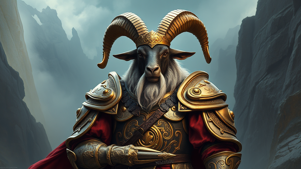 Majestic goat warrior clad in opulent Viking armor, exquisitely detailed and ornate, embodying a sense of luxurious prestige, with an aura that is both ominous and haunting. The scene is painted in a hypermaximalist style, reminiscent of cinematic matte artwork, seamlessly blending the artful influences of CGSociety masterpieces, infusing the ethereal touches of James Jean, the mystical charm of Brian Froud, and the dynamic flair of Ross Tran. This warrior stands amidst a dramatic backdrop, its presence commanding and enthralling, in a world where the extraordinary and the mythical collide.