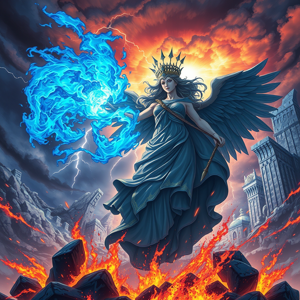 Majestic goddess Athena unleashing a torrent of powerful, dark blue energy flames in an anime style, 8K resolution scene, set against a vibrant backdrop of swirling blue infernal flames and radiant sparks. Amidst an apocalyptic landscape, the portrayal is both intricate and elegant, capturing a digital illustration that is scenic and hyper-detailed. A dramatic thunderstorm rages above, infusing the atmosphere with a burst of colorful lightning, creating a vivid and awe-inspiring spectacle.