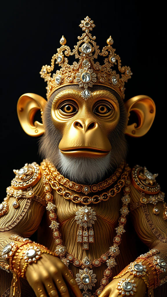 Majestic gold monkey adorned with opulent diamonds and shimmering silver, embodying the essence of wealth and divinity. Set against a deep black backdrop, the scene is intricately detailed and cinematically lit, capturing a surreal and hyper-realistic moment. Rendered in ultra-high definition, showcasing 8K clarity with the sophistication of a DSLR and Unreal Engine 5. The high-resolution octane render highlights every nuance, delivering an immersive cinematic shot that is both photo-realistic and dazzlingly vivid.