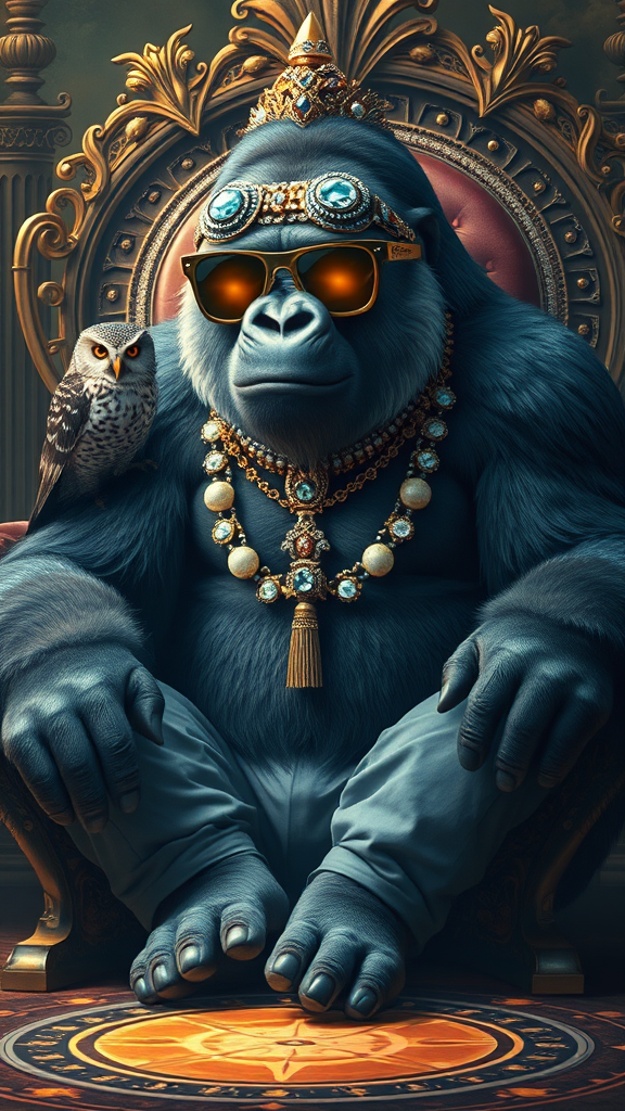 Majestic gorilla in photorealistic detail, adorned with exquisite eyewear perched atop its head. The creature is a fashion icon, wearing intricately designed goggles embedded with sparkling gems and gleaming gold accents. Jewelry drapes elegantly across its robust form, with a shimmering tassel hanging gracefully. A mystical aura surrounds it, enhanced by a radiant magic circle at its feet. The scene centers on a powerful male presence, seated upon an opulent throne, exuding authority. Beside it stands a regal owl, adding to the air of sophistication. The gorilla's ensemble is completed with stylish pants and polished shoes, exuding a unique sense of style with sunglasses adding an enigmatic touch.