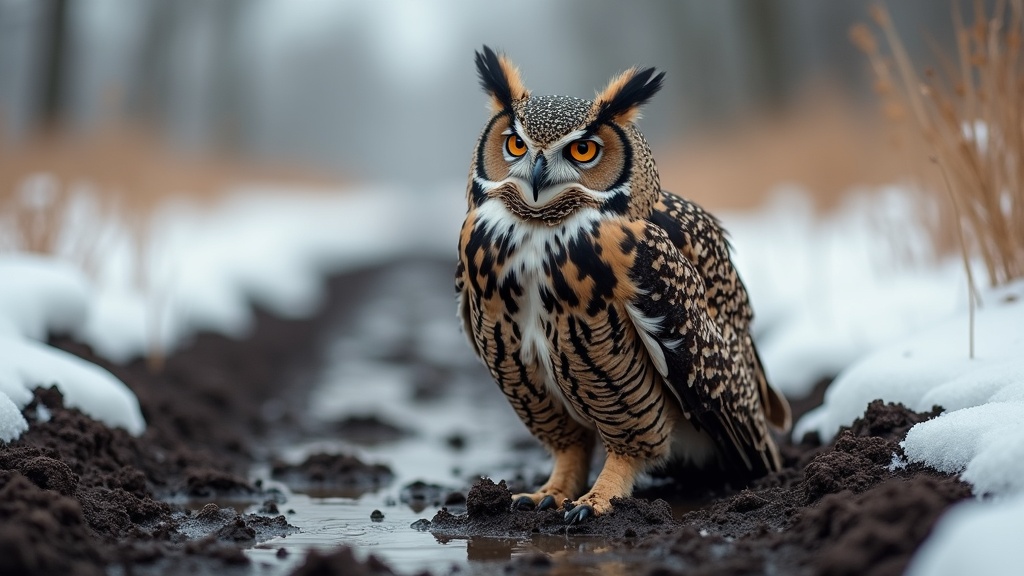 A striking great horned owl stands in a slushy, muddy path with patches of melting snow on a cold, overcast winter day. Its piercing orange eyes gaze forward, showcasing its beautiful patterned feathers against the muted background.