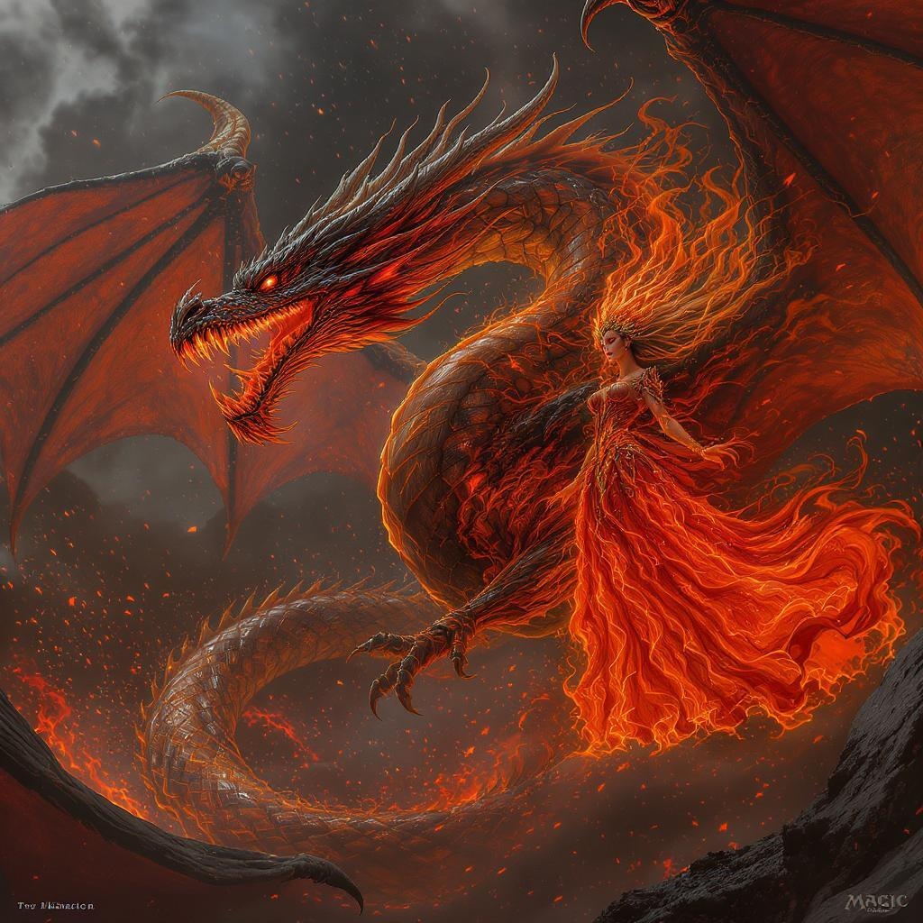 Majestic hyper-maximalist overdetailed cinematic, magnificent royal enormous fire dragon alongside his stunning queen of flames, reminiscent of Magic the Gathering, amidst swirling inferno in the dense dark fog backdrop, ominously intricate, octane-rendered, striking pose, ArtStation-grade perfect composition, with dramatic lighting and intense shadows, infused with orthodox symbolism, concept art style, ambient magic realism, high-definition 8k resolution, tribal dark fantasy essence, stylize 1000, showcasing a dynamic 3:2 aspect ratio.
