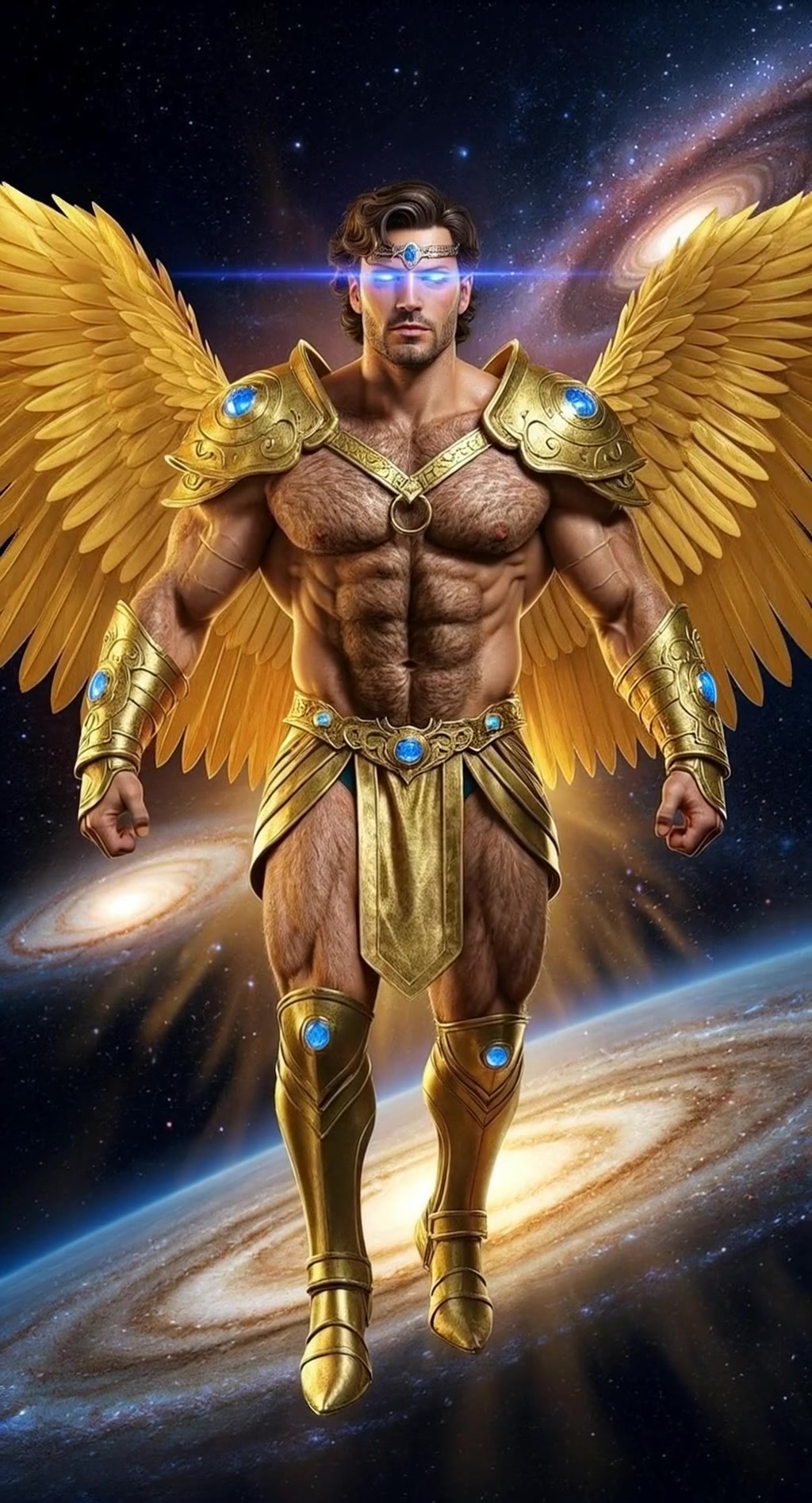 Majestic hypermasculine Archangel warrior, celestial guardian of the cosmos, epic heroic fantasy style, ultra-detailed digital art. Athletic bodybuilder physique with defined musculature, impressive 8-foot tall stature, broad V-tapered torso, expansive chest, and powerful limbs. Dense masculine body hair covers his sculptured chest, abs, arms, and legs. Chiseled Caucasian features with strong squared jawline, prominent brow, and classical Greek god-like facial structure. Dark brown hair styled in modern wavy fade, closely trimmed sides with artfully tousled curls on top. Intricate golden diadem with celestial engravings adorns his brow. Striking electric blue eyes radiating divine energy, ethereal glow effect. Ornate metallic gold armor: pauldrons with faceted sapphire cabochons, detailed filigree bracers, ceremonial chest harness with gleaming ring centerpiece, elaborate belt with azure gems. Luxurious metallic gold pteruges-style loincloth with dimensional draping. Knee-high armored boots with celestial motifs. Magnificent golden wings spanning 20 feet, individual feathers catching starlight, unfurled in dynamic flight pose. Superhero landing pose, soaring through deep space backdrop with spiral galaxies and nebulae. Volumetric god rays emanating from figure, golden hour lighting with rim highlights. Cinematic composition, dramatic foreshortening, extreme detail, photorealistic rendering, octane render, 8k resolution.