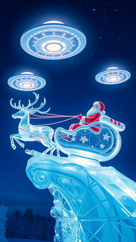 Majestic ice sculptures of Santa in an enchanted ice sleigh drawn by glistening ice deer soar through a starry night sky, engaging in an exhilarating aerial dance with glowing UFOs, creating a dazzling spectacle of light and crystalline wonder.