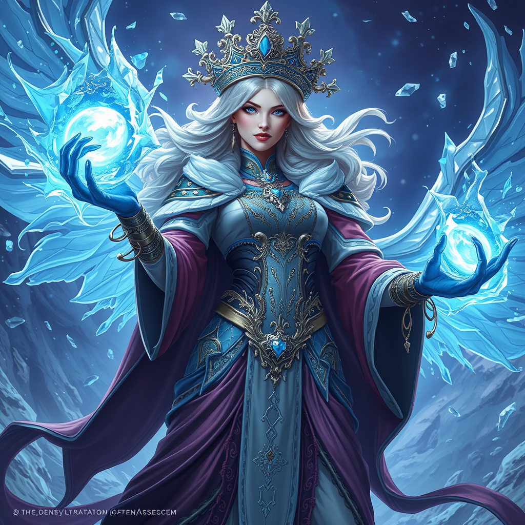 Majestic Ice Sorceress, Dungeons and Dragons adventure, enchanting fantasy realm, ornate and graceful, exquisitely detailed, digital painting, artstation concept art, crisp and vivid imagery, illustrative masterpiece, hearthstone-inspired, reminiscent of art by Artgerm, Greg Rutkowski, and Alphonse Mucha, ultra-high-definition, 8k resolution, with an aura of elegance and mystique.