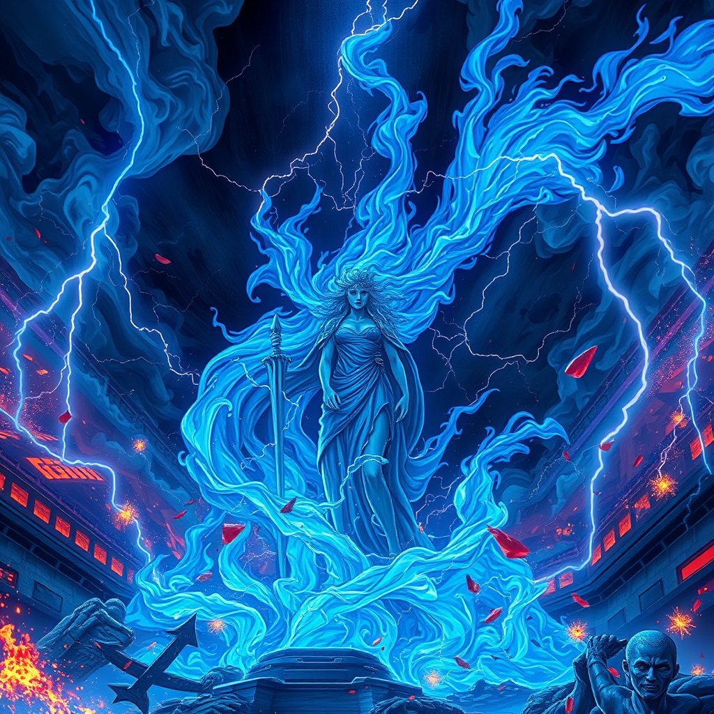 Majestic image depicting a powerful projection of intense dark blue energy flames, reminiscent of anime style, with an 8K resolution clarity; the goddess Athena stands amidst swirling blue infernal flames and sparks, set against an apocalyptic backdrop. The scene is colorful yet ominous, featuring intricate and elegant digital illustration techniques. The atmosphere buzzes with hyper-detailed textures, capturing the raw beauty of a thunderstorm in full force, the lightning crackling vividly through the sky.