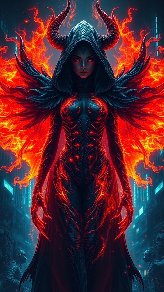 Majestic Infernal Beauty from the Depths, Cloak of Flames, ideal symmetry, Cyberpunk Edgerunner vibe, nocturnal ambiance, exhaling flames, icy turmoil, vivid contrast, expansive perspective, 8K resolution, glistening, refined illustration, inspired by Loish and Jeremy Mann, complete figure portrayal, character design, electric waves, immersive CGI, radiant neon, futuristic urban fashion, neon metropolis backdrop. Avoid duplication, maintain clarity and abstraction, ensure cohesive anatomy, focus on realistic proportions and detailed artistry, vibrant and balanced colors, sharp detail without distortion or inaccuracies in physical form.