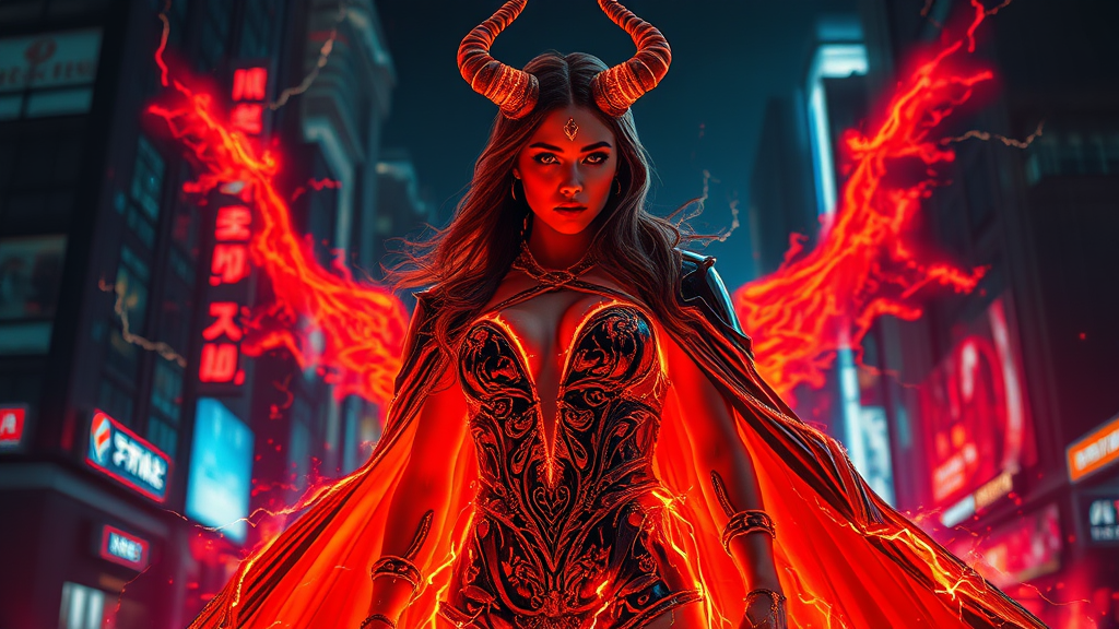 Majestic Infernal Beauty from the Underworld, Enveloped in a Fiery Cape, Ideal Proportions, Cyberpunk Edgerunner Influence, Vibrant Night Setting, Emitting Flames, Frigid Chaos with Stark Contrast, Seen from Afar, Ultra-High Definition, Ethereal Sheen, Intricate Imagery, Inspired by Loish and Jeremy Mann, Full-Body Portrait, Concept Art, Lightning Effect, Three-Dimensional CGI, Luminous Neon Highlights, Futuristic Urban Attire, Neon Cityscape Backdrop, No Duplicates, Crisp Abstract Style, Seamless Form, Distinctive Character, Flawless Anatomy, Rich Colors, No Watermarks, Clear Focus, Balanced Proportions, Perfect Limbs, Smooth Execution.