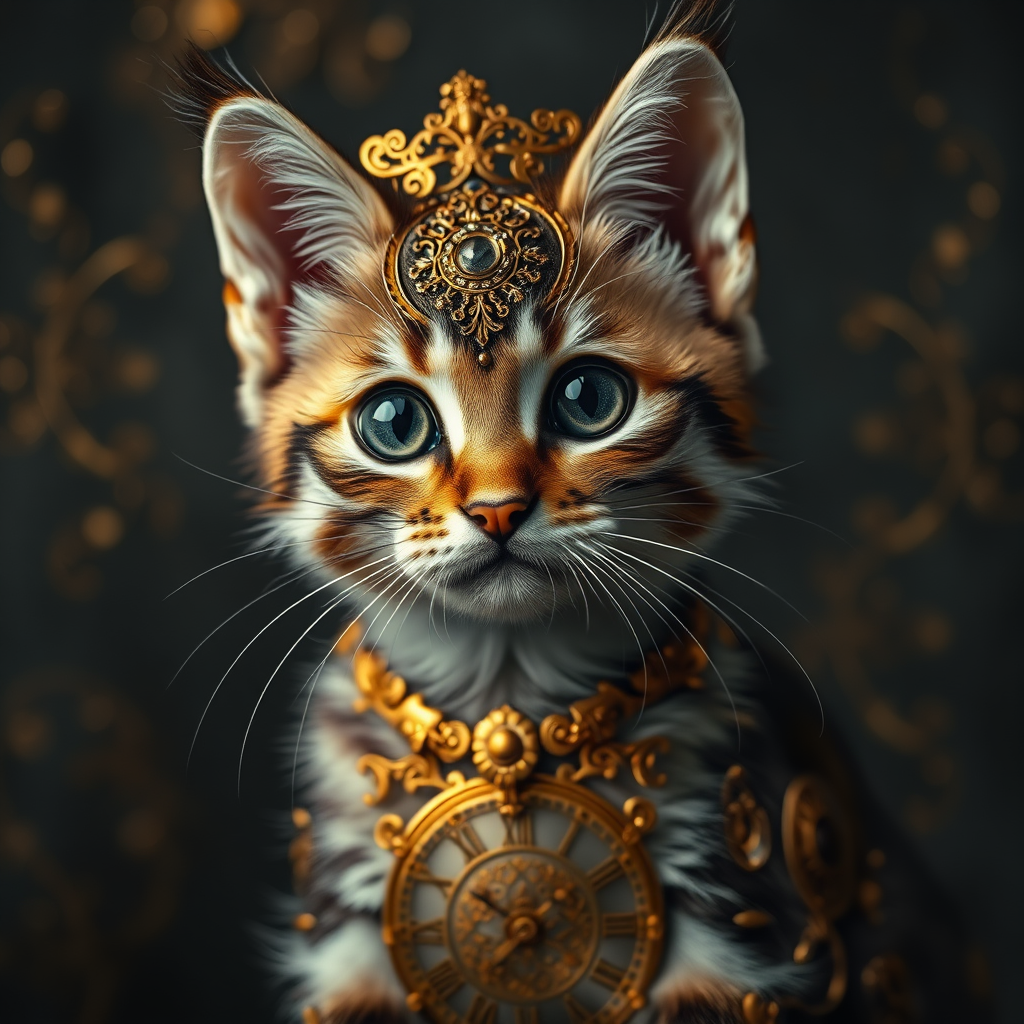 Majestic kitten adorned in intricate gold clockwork patterns and dazzling golden filigree against a moody, abstract dark backdrop, capturing the essence of chiaroscuro. The scene is rendered in stunning photorealism and hyper realism, evoking a sense of dynamic acceleration with ultra-high detail. The image is cinematic in scope, utilizing a long exposure to emphasize the intricate features, presented in breathtaking 8K and HD super resolution, maintaining the core elements of grandeur and elegance with a touch of ethereal charm.