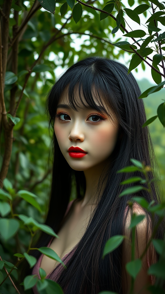 Majestic Korean girl with serene porcelain skin, full lips, delicate nose, luxuriant raven hair, doll-like features, bright and expressive symmetrical eyes with intricate details, shaded eyelids, delicate eyelashes, high cheekbones, slender neck, minimalist makeup, rustic natural surroundings, lush greenery, minimal muted color palette, overcast sky, soft subtle glow, dappled sunlight filtering through dense foliage, dramatic contrast between light and dark, HDR, predominantly low-contrast, deliberately imprecise brushstrokes, rough texture, slight JPEG compression artifacts, sometimes crudely painted, innocence, beauty, mystery.