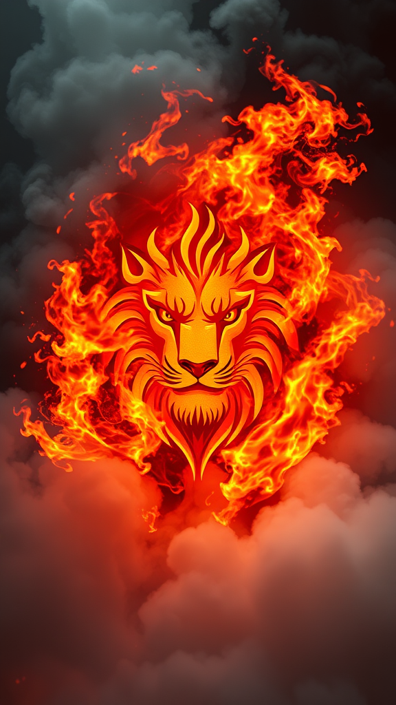 Majestic lion champion emblem engulfed in fiery blaze and swirling smoke, exuding fierce intensity and warrior spirit.