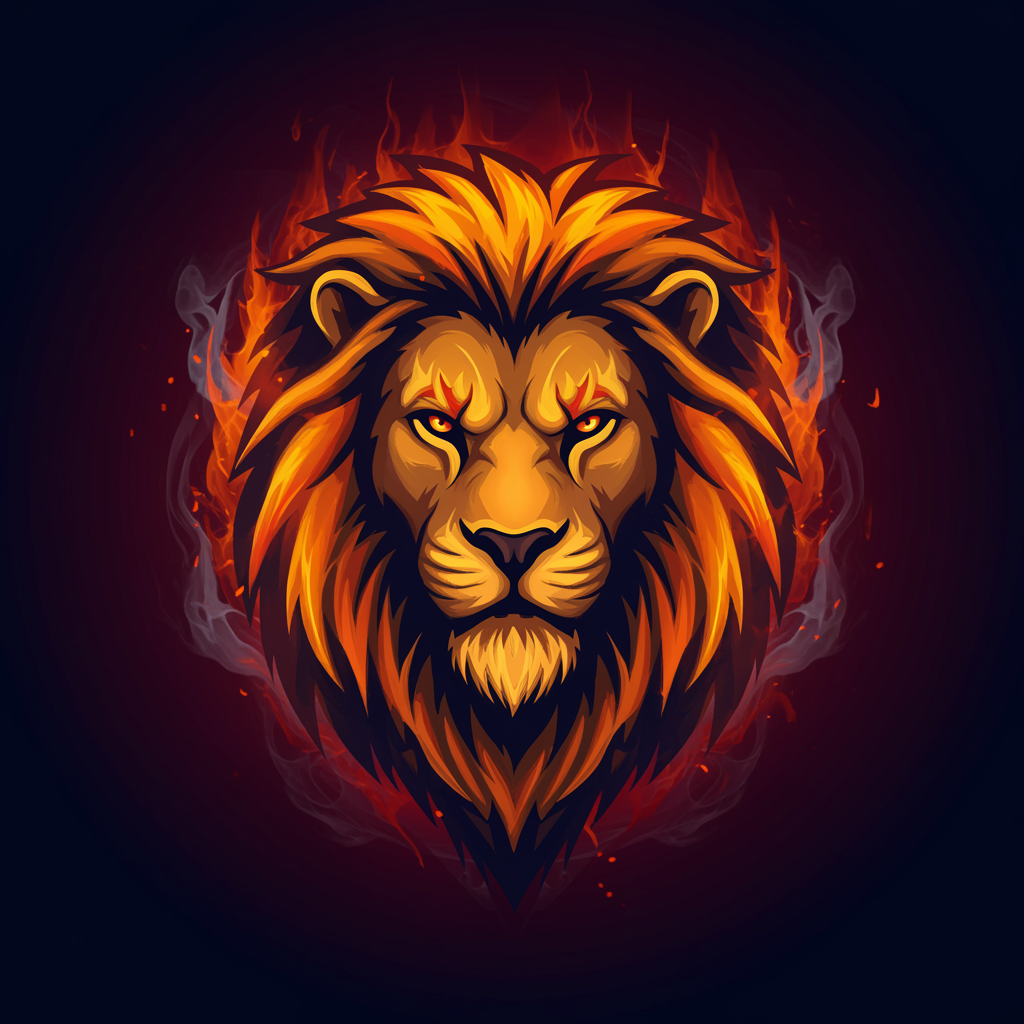 Majestic lion champion emblem with flames and swirling smoke, exuding fierce intensity and powerful determination.