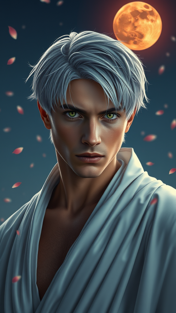 Majestic male figure with striking green eyes and short silver hair, draped in an elegant white robe, captured in a front portrait shot with a shallow depth of field. The scene unfolds under the ethereal glow of a blood moon on a clear night, as delicate flower petals dance through the air. Side lighting highlights his features while moonlight bathes the scene in a mystical ambiance, vivid in 8K detail.