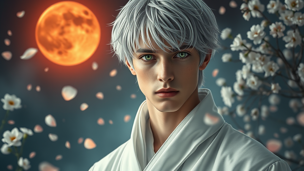 Majestic male with striking green eyes and short silver hair, clad in an elegant white robe, stands amidst a mystical scene under a blood moon. Flower petals drift through the night air, while moonlight casts a gentle glow on his face in a front portrait shot with side illumination. The scene captures an ethereal atmosphere with an 8K resolution, enhancing the intricate details and depth of field at f/1.8, portraying a true masterpiece.
