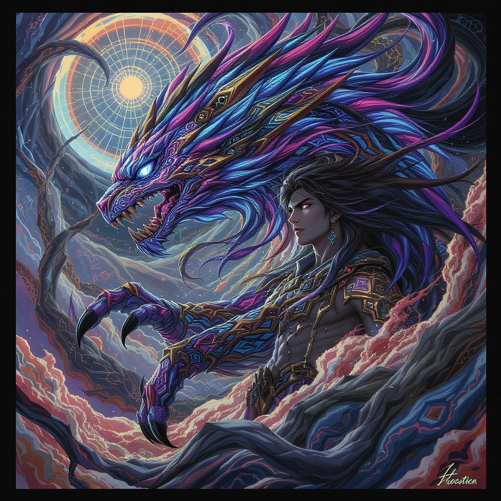 View this AI-generated image featuring majestic male youth envisions a mystical totem spirit animal adorned in aztec inspired tribal greeble patterns radiating vibrant fantasy allure intricate ornate design with hearthstone and ankama influences capturing the dynamic energy of a gta5 cover style ins