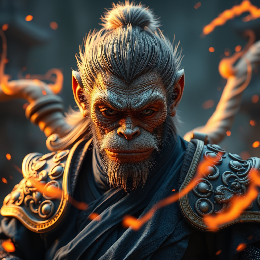 Majestic masterpiece concept art featuring a mid shot of Sun Wukong, the Monkey King, in a dynamic and centered pose. The image captures a solo, male focus with fiery effects highlighting his detailed eyes and a shaded face. He wears intricate Chinese armor with blue-toned clothing and ornate pauldrons, crafted with stunning detail as if rendered in Unreal Engine in ultra-high-definition 8k. The composition boasts super detail with a rich depth of field and studio lighting, evoking the essence of award-winning splash art.