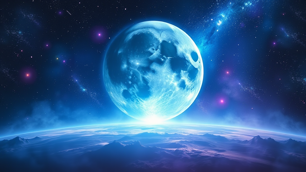 Majestic moon descending toward the earth, enveloped by vibrant and surreal hues highlighting blues and purples; surrounding galaxies illuminate an otherworldly cosmic atmosphere, infused with a dreamlike and abstract essence, evoking a sense of awe and mystery as celestial elements intertwine in a harmonious embrace.