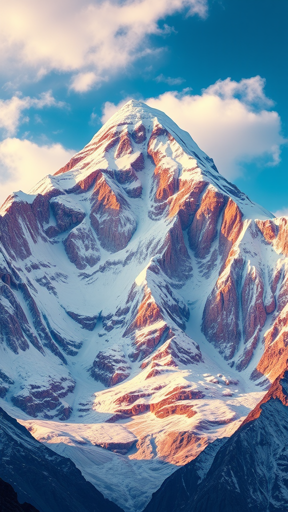 Majestic Mount Everest depicted as a vibrant and intricate wallpaper design, featuring colorful realism with modular elements and intense close-ups that highlight the textures and contours of the mountain. Ultra-high-definition imagery captures the realism and depth of the scene, with dynamic interplay of colors and details creating an almost surreal yet breathtakingly authentic representation of the iconic peak.