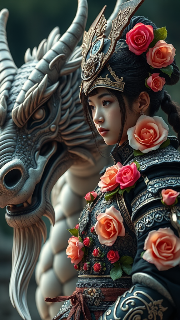 Majestic mythical beast by the side of a young Japanese samurai girl, her intricate armor adorned with vibrant, blooming roses and glistening crystals; the scene is captured in an ultra-realistic 8k resolution with photography lighting, highlighting every exquisite detail from the close-up angle, presenting an ethereal blend of tradition and fantasy in high definition.
