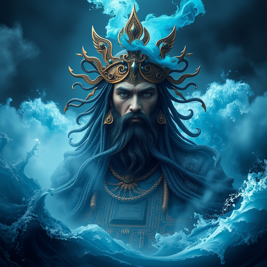 Majestic ocean sovereign amidst swirling waves, enveloped by a shroud of blue mist and fog; an imposing figure with a flawless visage, his full form grounded on an intricate circuit board. Clad in lavishly detailed attire, exuding an essence of fantasy blended with tribal dark fantasy. A hyper-maximalist art piece bursting with detail, reminiscent of cinematic art seen on ArtStation. Achieving realism through an 8k resolution Ultra-detailed 3D Octane Render; photorealistic concept art that captures sharp focus and perfect composition. Imposing shadows and dramatic lighting enhance the visual narrative, crafted for high-definition HDR wallpaper.