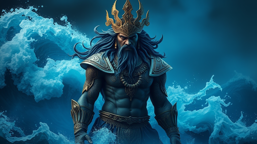 Majestic ocean sovereign with a fierce demeanor amidst spiraling waves, engulfed in blue mist, with a glorious and flawless visage, standing resolute on the shoreline. His attire is an elaborate fusion of metallic circuit patterns and tribal motifs, exuding an air of ancient mystery. The scene is set against a backdrop of fantasy elements, vividly captured in a hyper-maximalist and intricately detailed style. The vivid 8k quality lends a cinematic and photorealistic depth, with intense lighting and shadow contrasts, offering a sharp focus and perfect composition. The atmosphere is dark fantasy, enveloped in HDR intensity, ideal for a high-definition wallpaper.